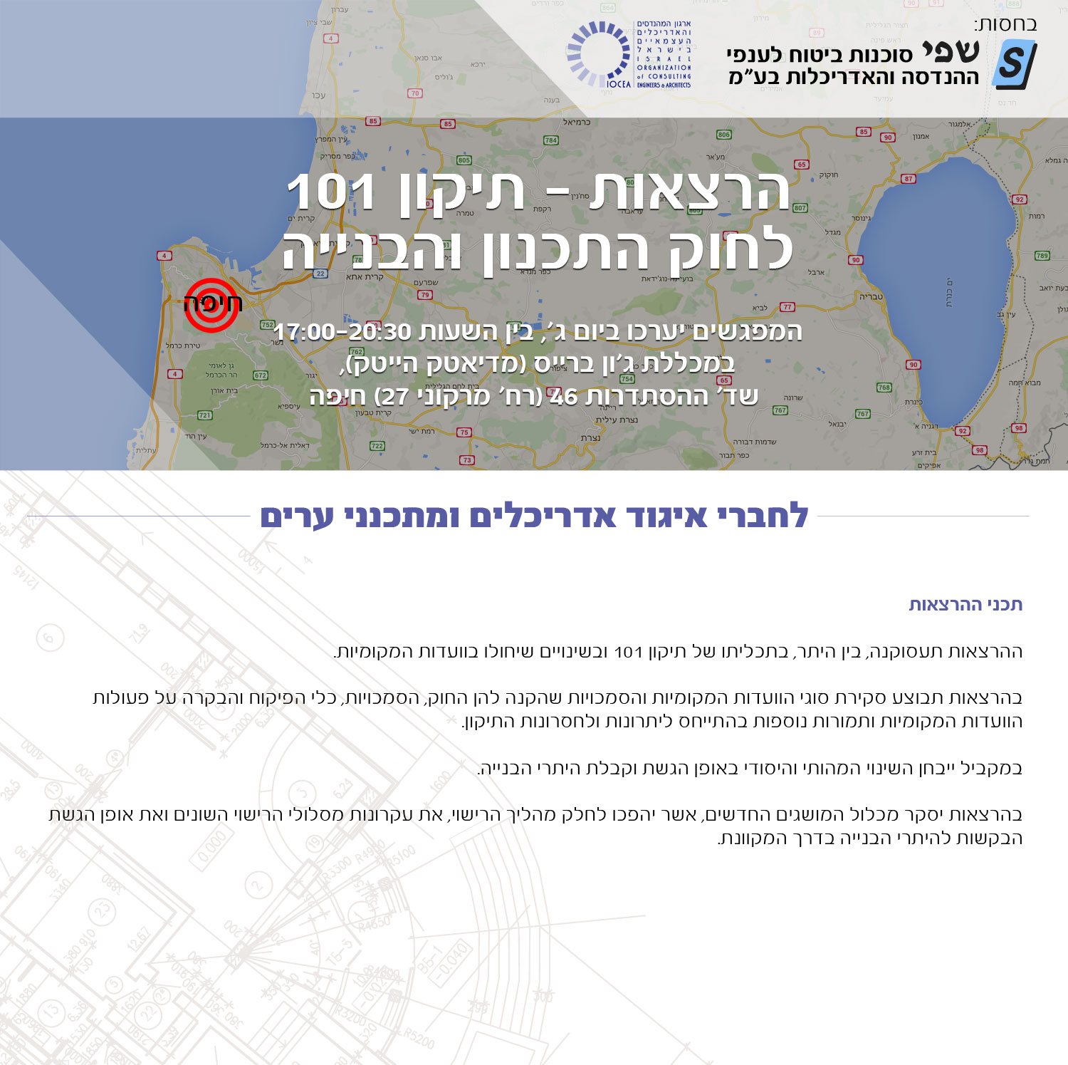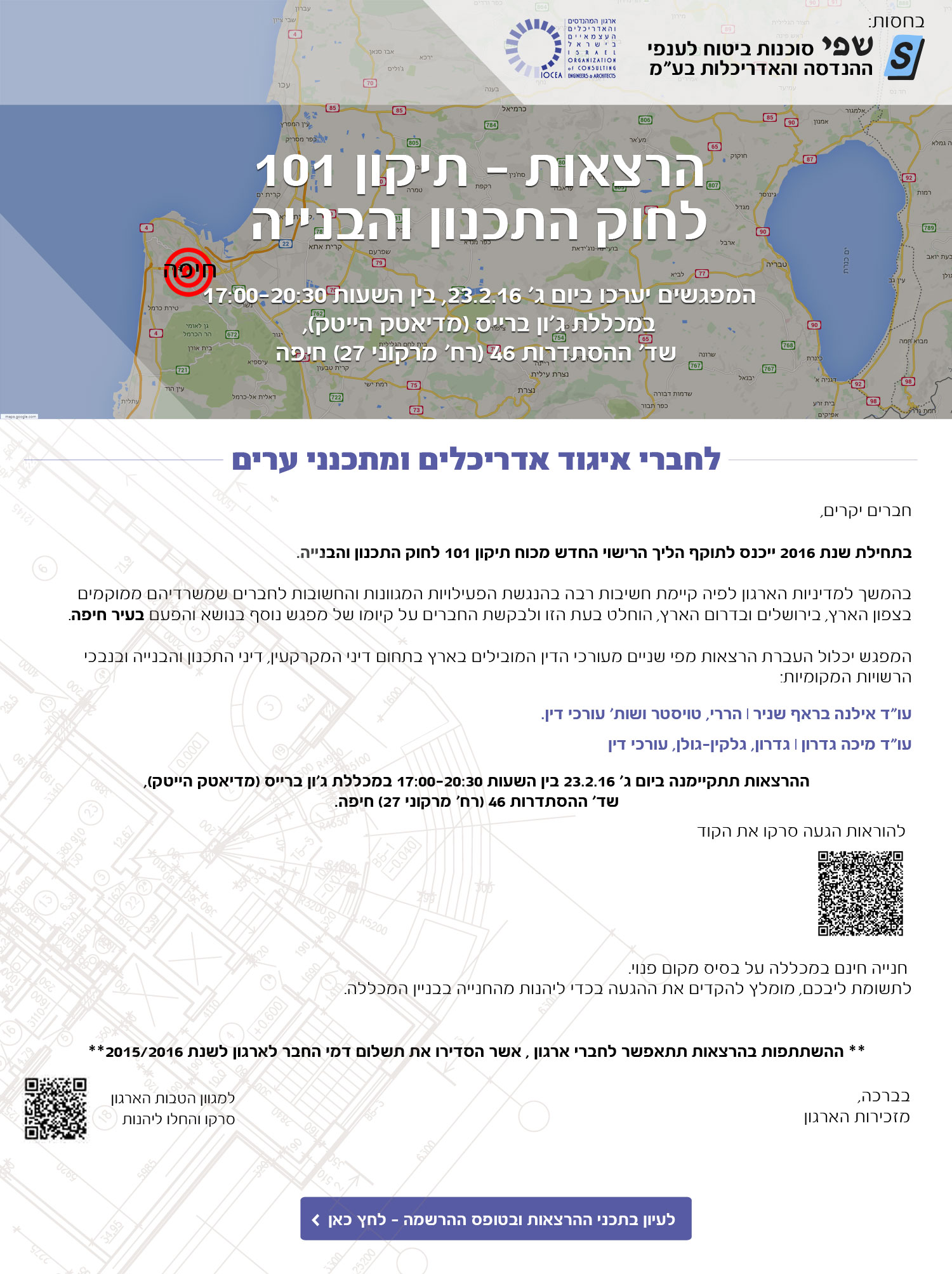 נותרו מס' מקומות למהירי החלטה! הרצאות נוספות בנושא תיקון 101 לחוק התכנון והבנייה 23.2.16 / לחברי הארגון בצפון הארץ ובכלל