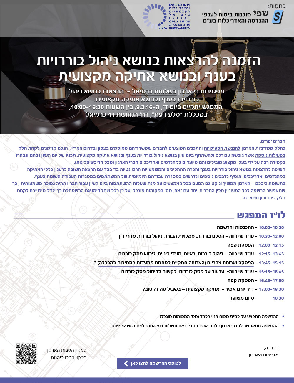 ההרשמה בעיצומה למפגש חברי ארגון בשלוחת כרמיאל שיתקיים ביום 9.3.16 - הרצאות בנושא ניהול בוררויות בענף ובנושא אתיקה מקצועית