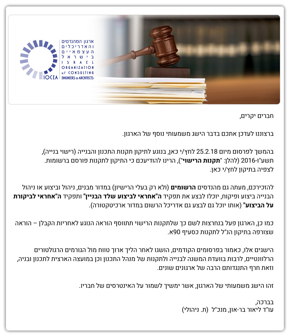 הארגון ממשיך לפעול למענכם - עדכון בדבר פרסום תיקון תקנות התכנון והבניה (רישוי בניה) תשע״ו, 2016 - ברשומות