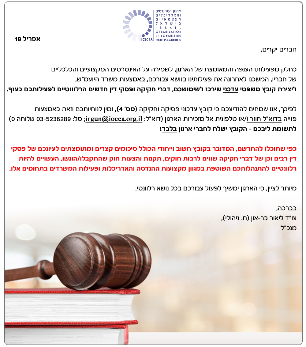 חדש עבור חברי הארגון בלבד - מהדורת אפריל 18 לעדכוני חקיקה ופסיקה בדיני תכנון ובניה ( עדכון מס' 4 )