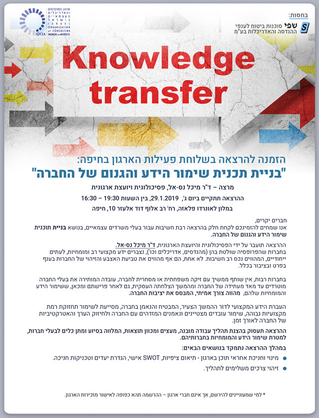 ממשיכים לפעול עבורכם בשלוחת פעילות הארגון בחיפה - הזמנה להרצאה בנושא 'בניית תכנית שימור הידע והגנום של החברה