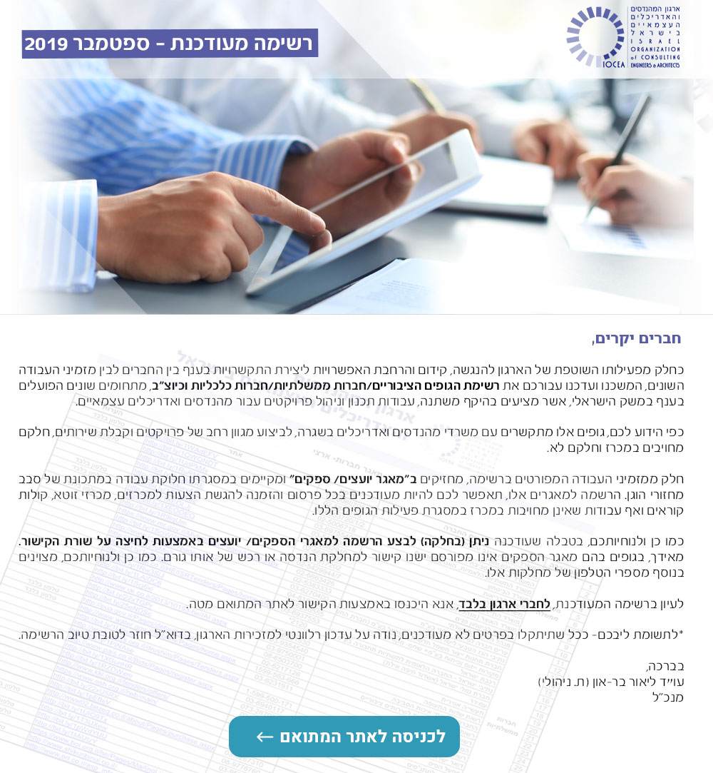הארגון ממשיך לפעול למענכם - רשימה ארצית מרוכזת ומעודכנת של גופים ציבוריים/ממשלתיים אליהם ניתן לבצע הרשמה למאגרי הספקים/היועצים (ספטמבר 2019)