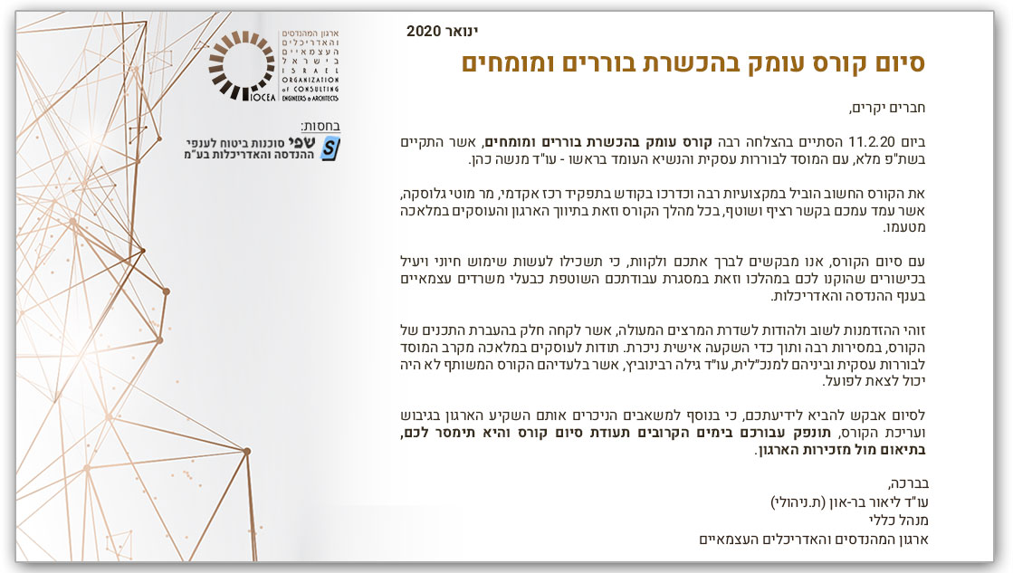 הודעה בדבר סיום קורס להכשרת בוררים ומומחים