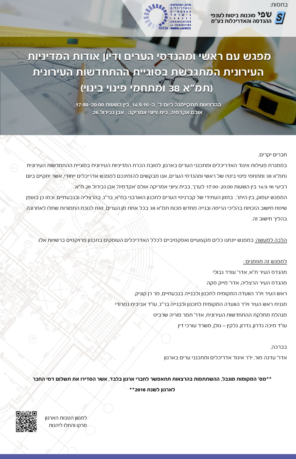 ההרשמה הסתיימה ! לא נותרו מקומות נוספים - מפגש עם ראשי ומהנדסי ערים ודיון אודות המדיניות העירונית המתגבשת בסוגיית התחדשות עירונית (תמ"א 38 ומתחמי פינוי בינוי) - 14.9.16