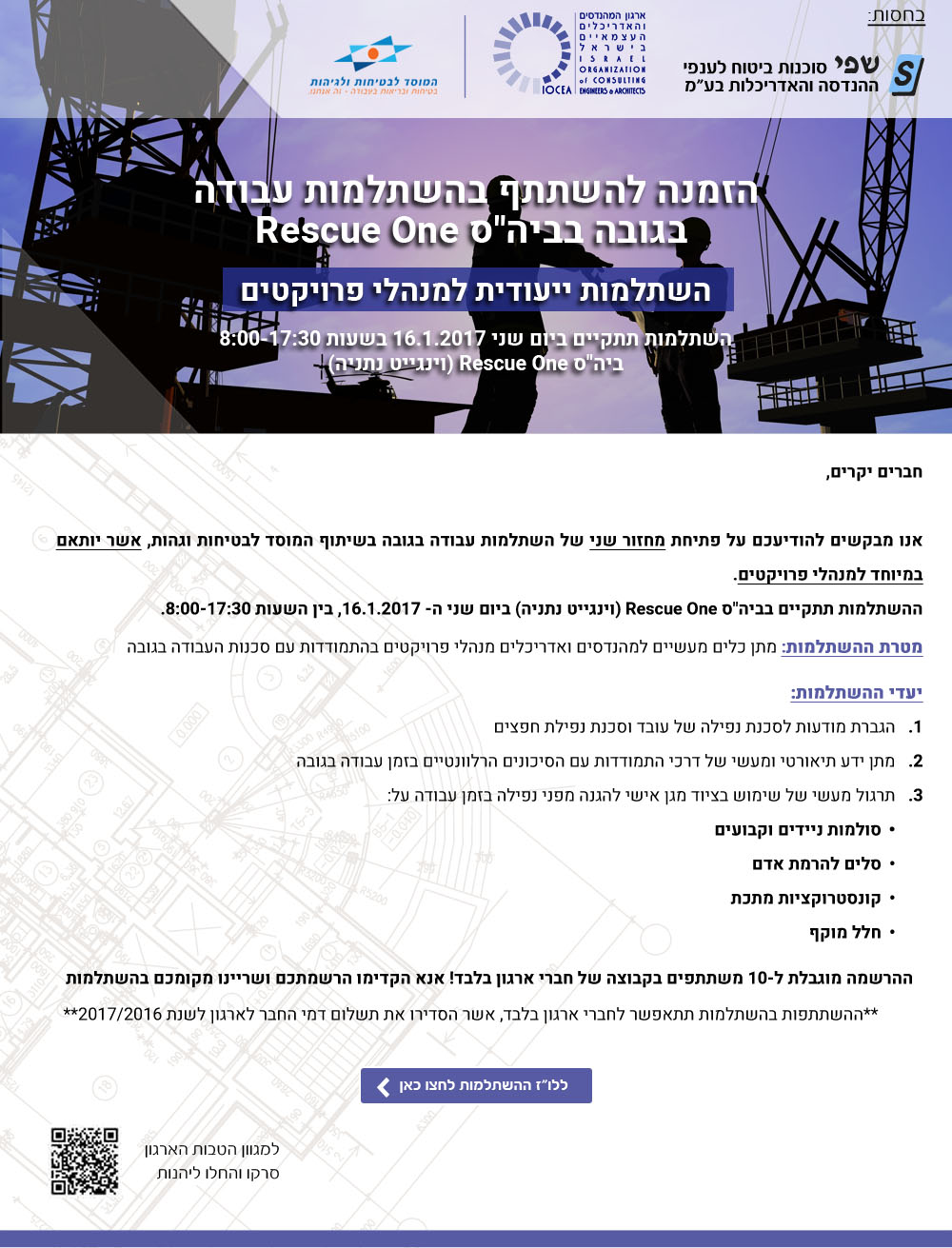ההרשמה הסתיימה ! ( לא נותרו מקומות ) - השתלמות עבודה בגובה למנהלי פרויקטים- 16.1.2017