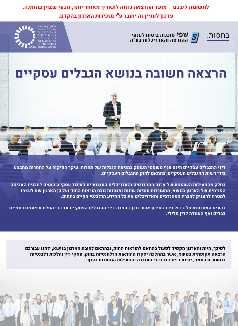 הודעה בדבר דחיית מועד קיום הרצאה בנושא הגבלים עסקיים