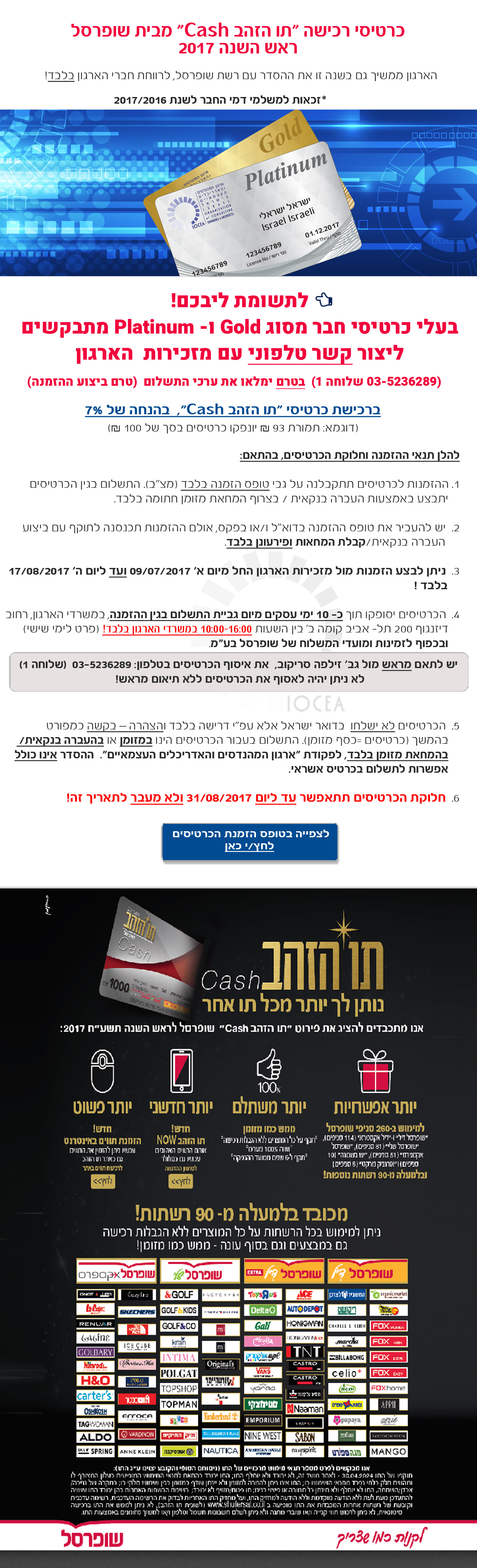 הזמנה לרכישת כרטיסי "תו הזהב CASH" מבית שופרסל ראש השנה 2017 - לחברי הארגון בלבד! - הרכישה הסתיימה